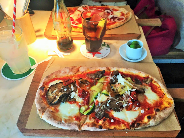 vegetables. The pizza is cooked in a wood-fired oven, and came out en fuego